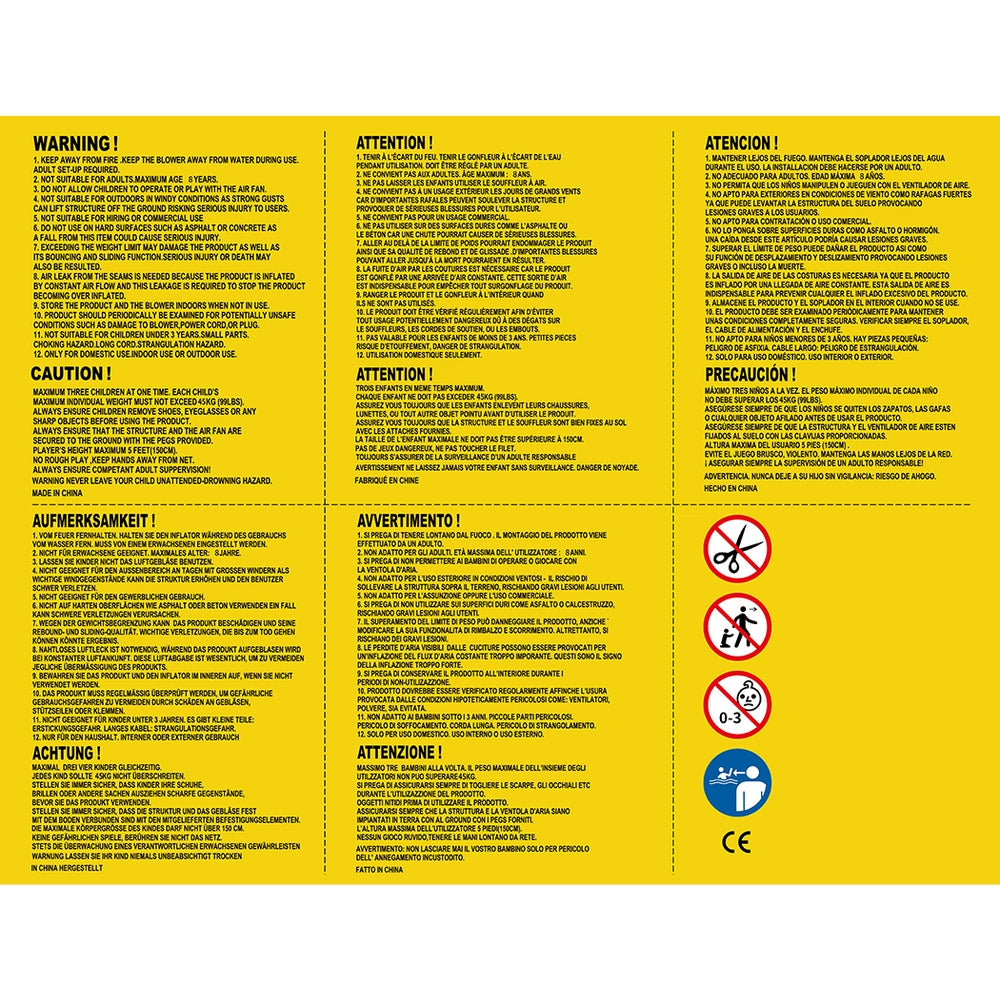 Crafted from durable PVC-coated polyester, this inflatable wonder is not only bright and cheerful but also built to withstand the elements with its UV protection. Setting it up is a breeze; with the included electric blower, the park inflates in just a couple of minutes. And when the fun is done, the quick-drain valve makes emptying it hassle-free. Plus, with ground stakes provided, you can ensure everything stays securely in place as the kids play.