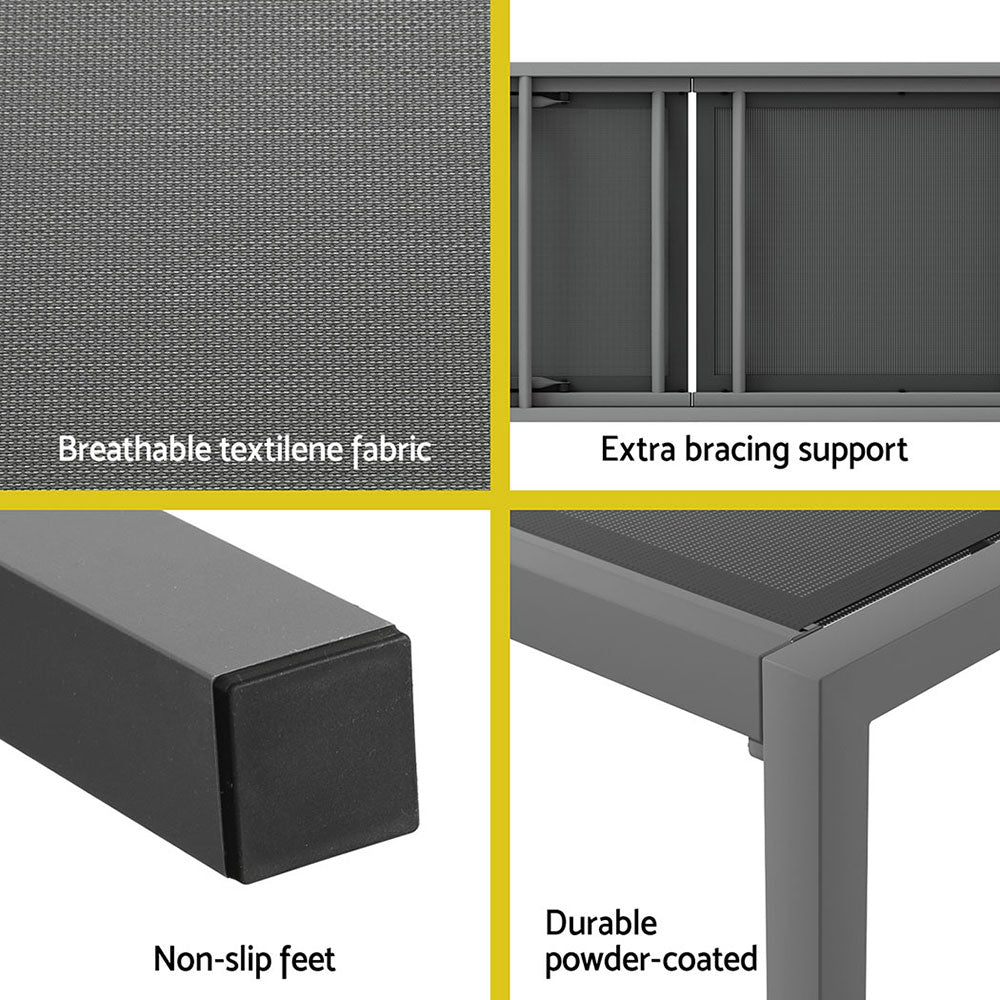 Embrace the sunshine like never before with the Gardeon Sun Lounger, your perfect companion for those lazy afternoons. Crafted with a breathable textilene fabric draped over a robust powder-coated aluminium frame, this lounger is designed to stand the test of time, whether it's basking in the sun or enduring the occasional drizzle. It's built tough, resisting weather and corrosion, so you can relax with confidence. The non-slip feet ensure it stays firmly in place, while the extra bracing adds stability, comfortably supporting up to 150kg.