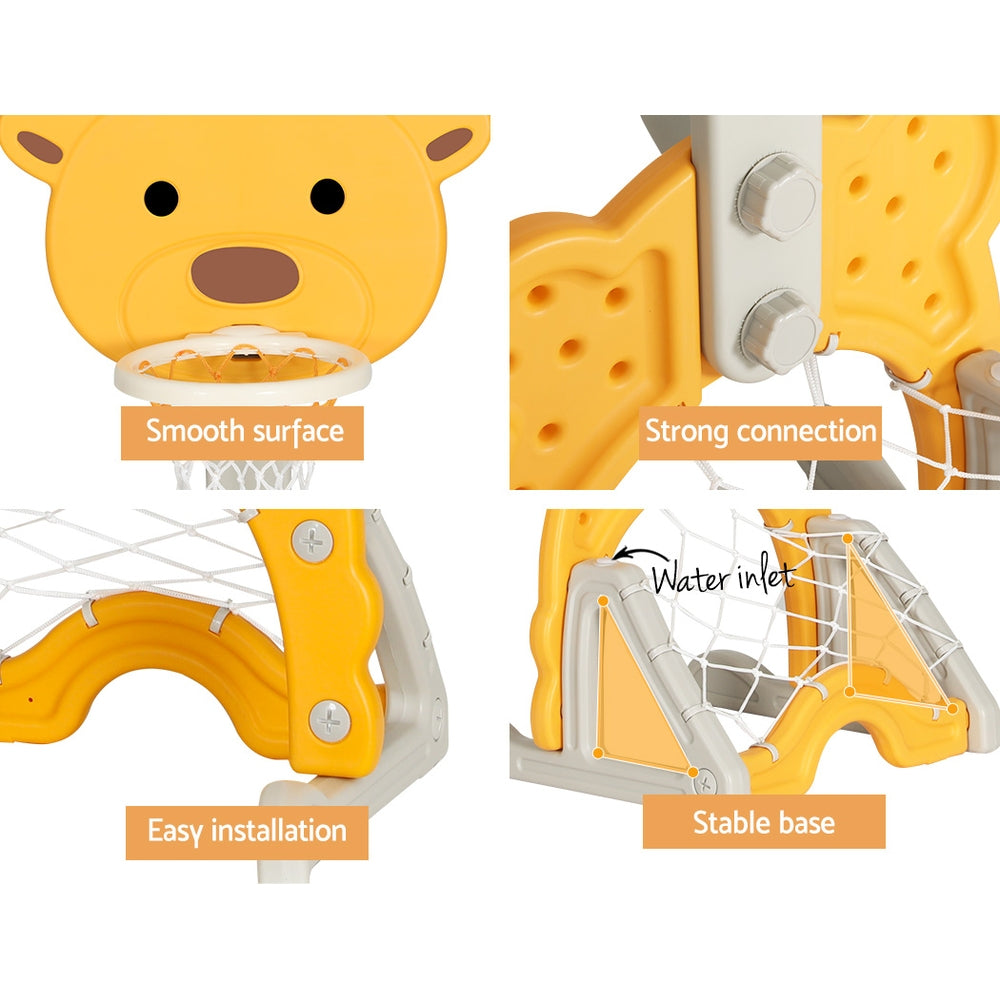 Introduce your little ones to the joy of sports with the Keezi Children's Basketball Hoop Set, designed to spark a lifelong love for physical activity. Crafted from safe, non-toxic PP material, this sturdy hoop features a smooth surface and a stable triangular base, perfect for kids aged 3 to 7. But it’s not just a basketball hoop; it’s a whole 5-in-1 activity centre packed with fun. Alongside basketball, your kids can enjoy a soccer game, try their hand at ring toss, play a round of golf, and even groove to tunes from the removable music box.