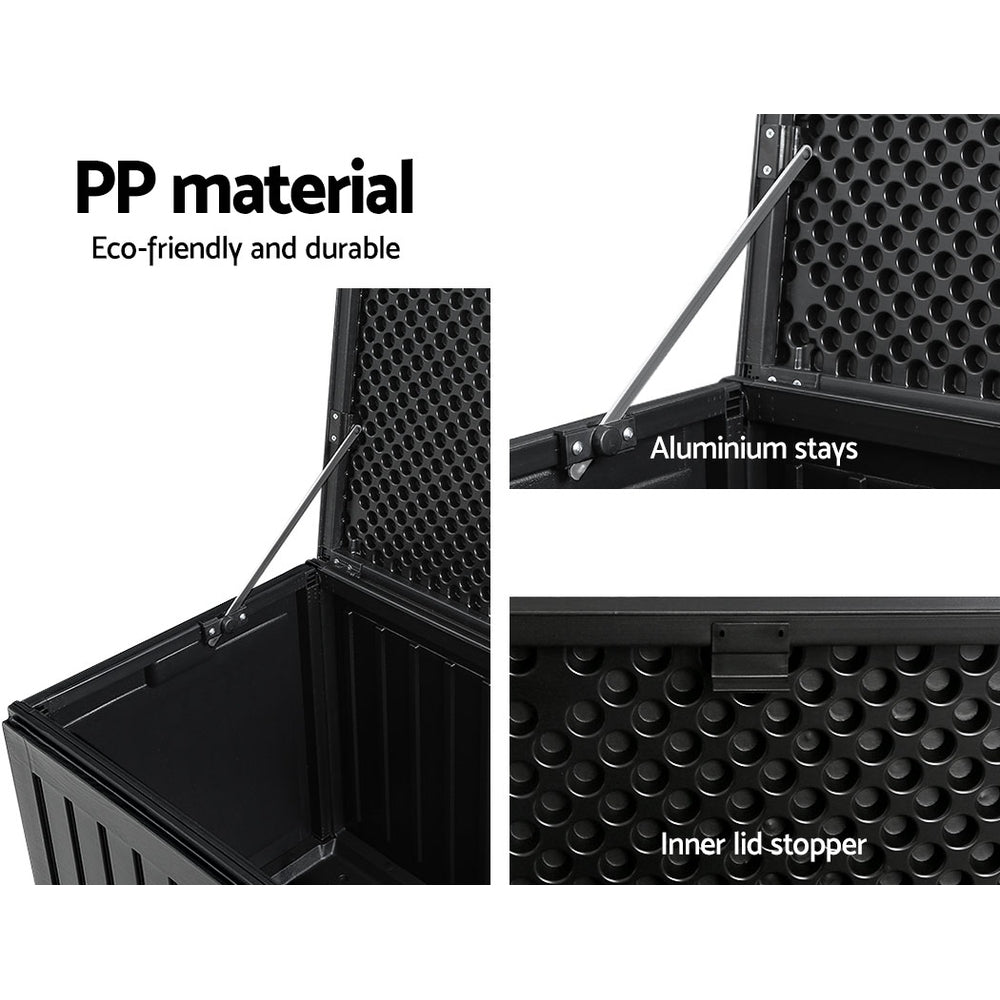 Built from durable polypropylene with a sleek black finish, it’s made to handle whatever the Aussie weather throws at it. Aluminium hinges and a smooth-opening lid with stopper make it easy to access your stuff, and the lockable top adds a bit of extra security. Need to move it? Side handles make it simple.