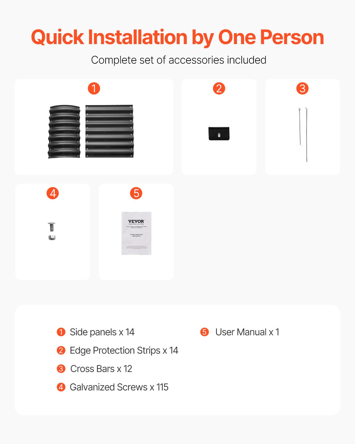 Setting up your new garden bed is a breeze, taking just about 15 minutes to assemble with the complete set of screws and a handy pre-drilled design. No extra tools are needed, making it an ideal choice for both seasoned green thumbs and beginners alike. Included in the package are 14 side panels, 12 cross bars, 14 edge protection strips, 115 galvanized screws, and a user manual to guide you through the process. Get ready to unleash your inner gardener and create the garden of your dreams!
